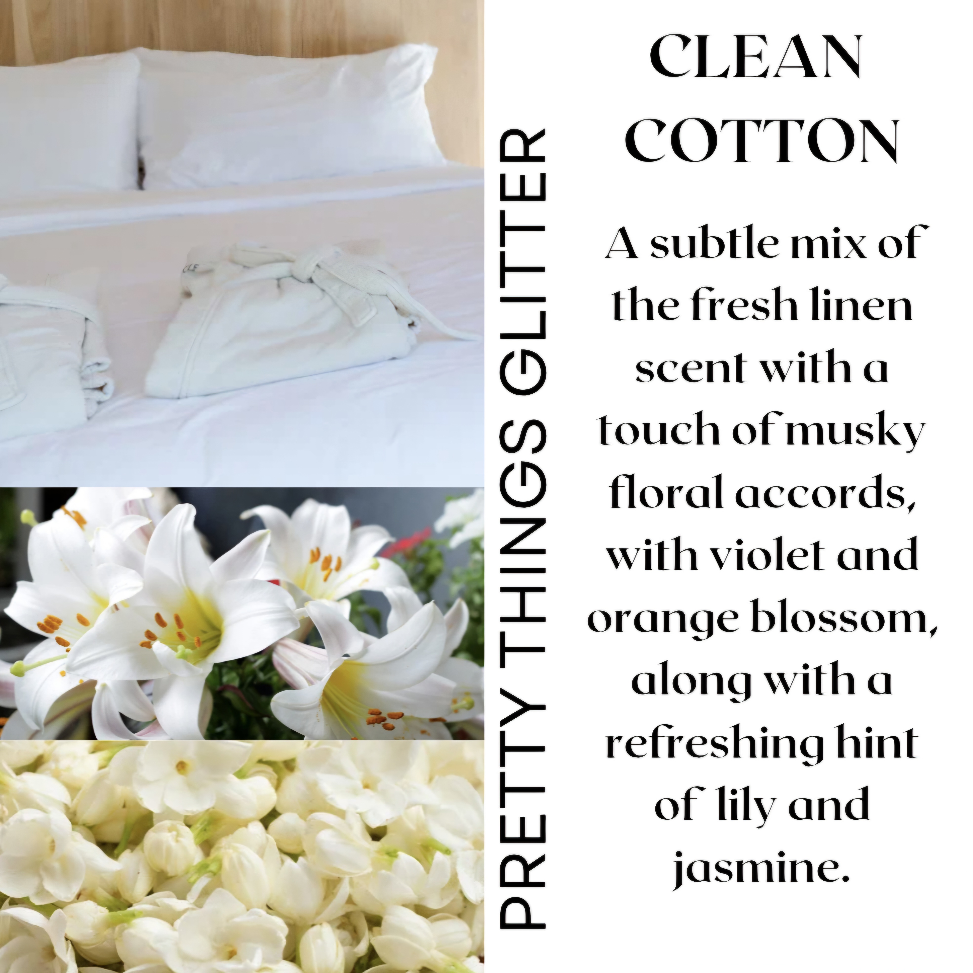 The scent Clean Cotton is a subtle mix of the fresh linen scent with a touch of musky floral accord with violet and orange blossom, along with a refreshing hint of lily and jasmine. (This is a very strong scent, only use a small amount to start and increase if needed)