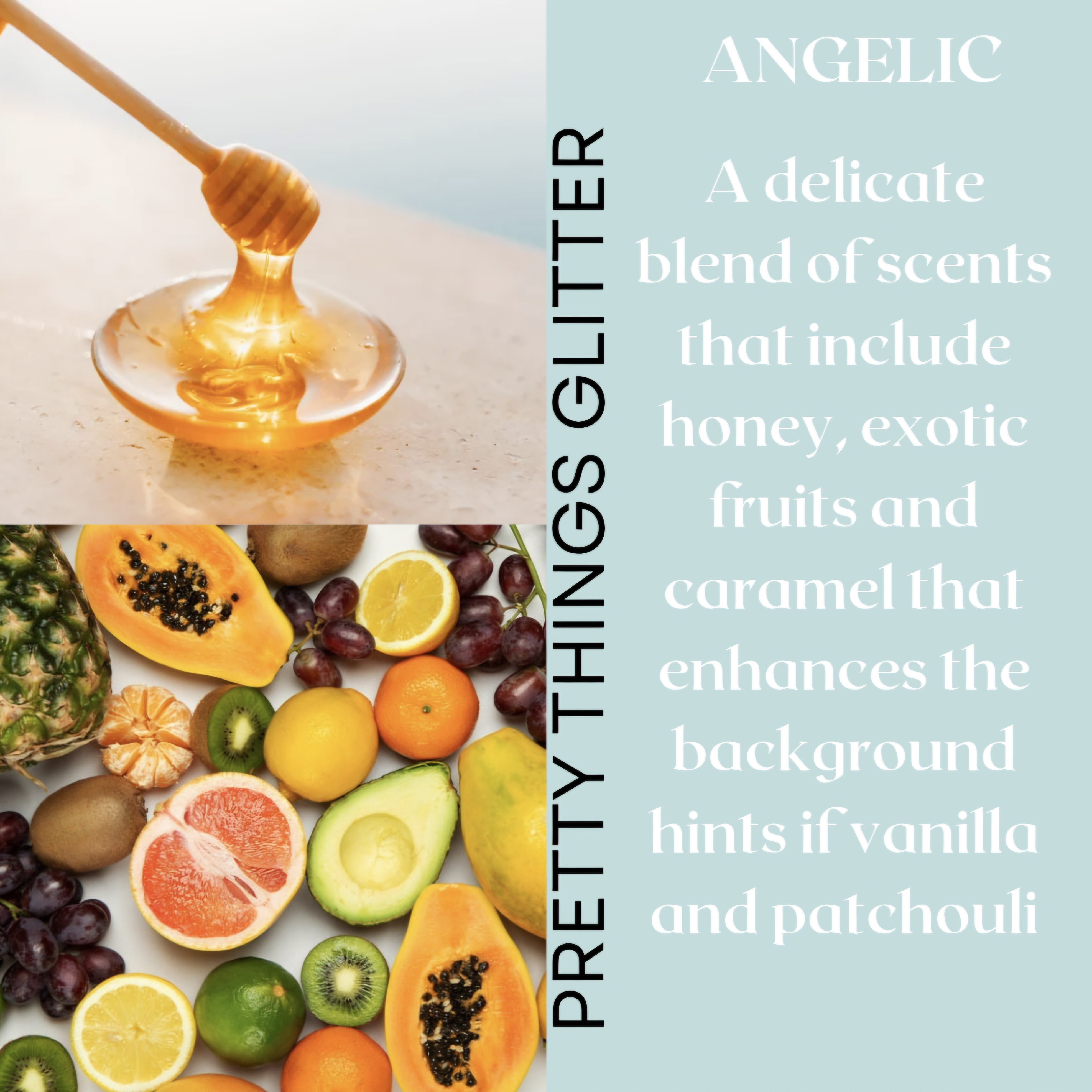 The scent Angelic is a delicate blend of scents that include honey, exotic fruits and caramel that enhances the background hints of vanilla and patchouli.