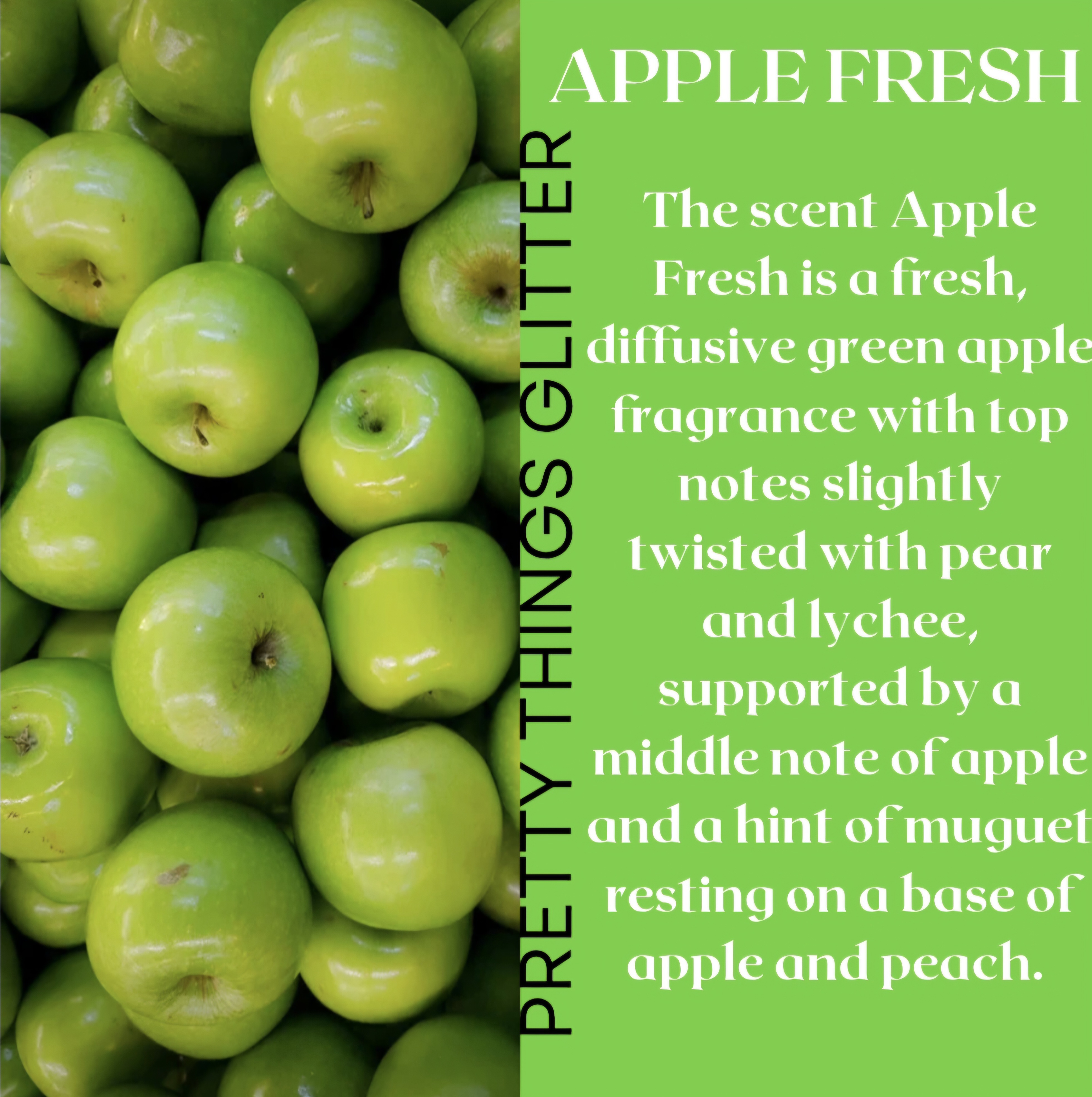 Apple Fresh is a fresh, diffusive green apple fragrance with top notes slightly twisted with pear and lychee, supported by a middle note of apple and a hint of muguet resting on a base of apple and peach.
