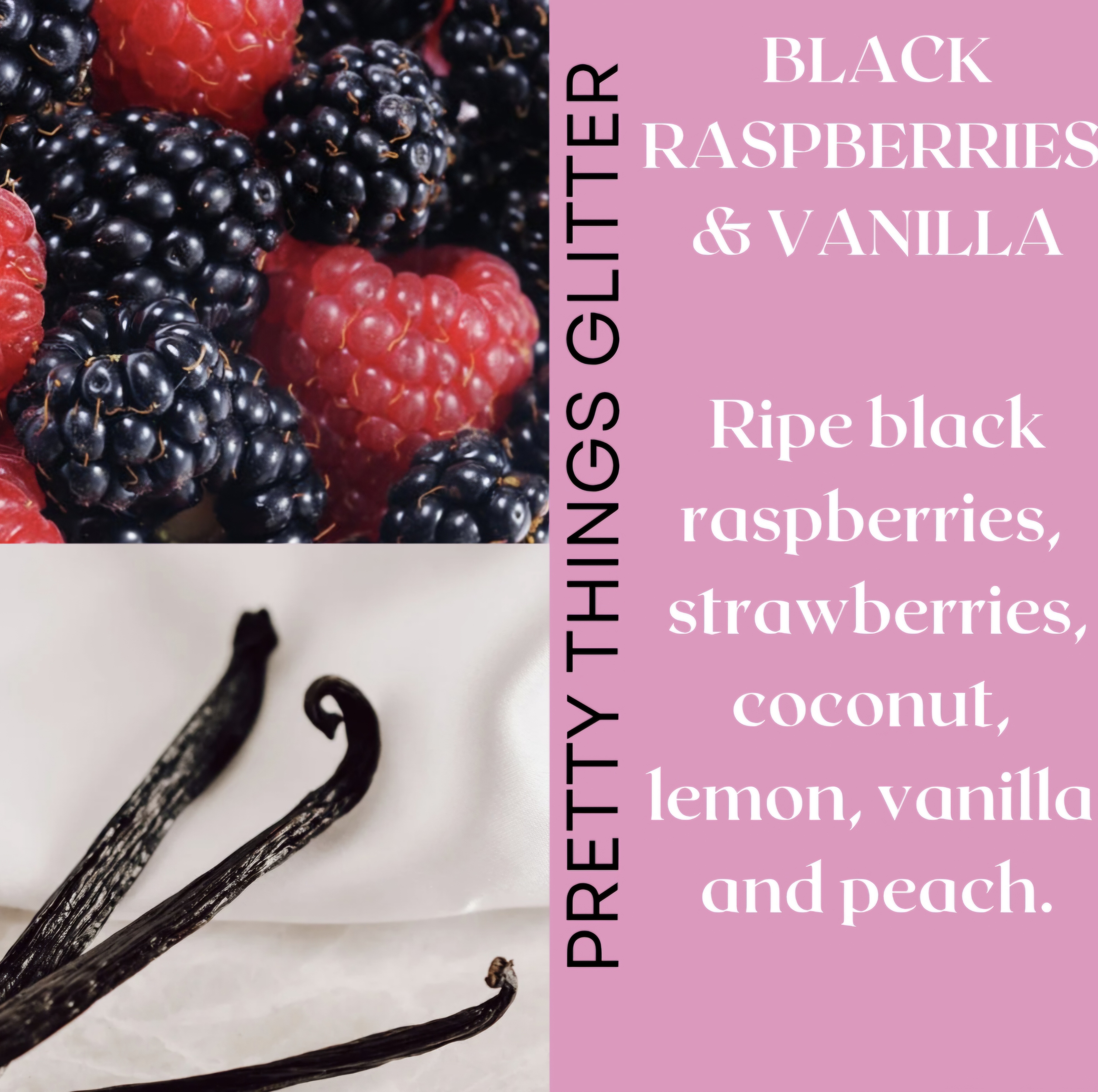 The scent Black raspberry & vanilla is a luscious blend of ripe black raspberries, strawberries, coconut lemon, vanilla and peach.