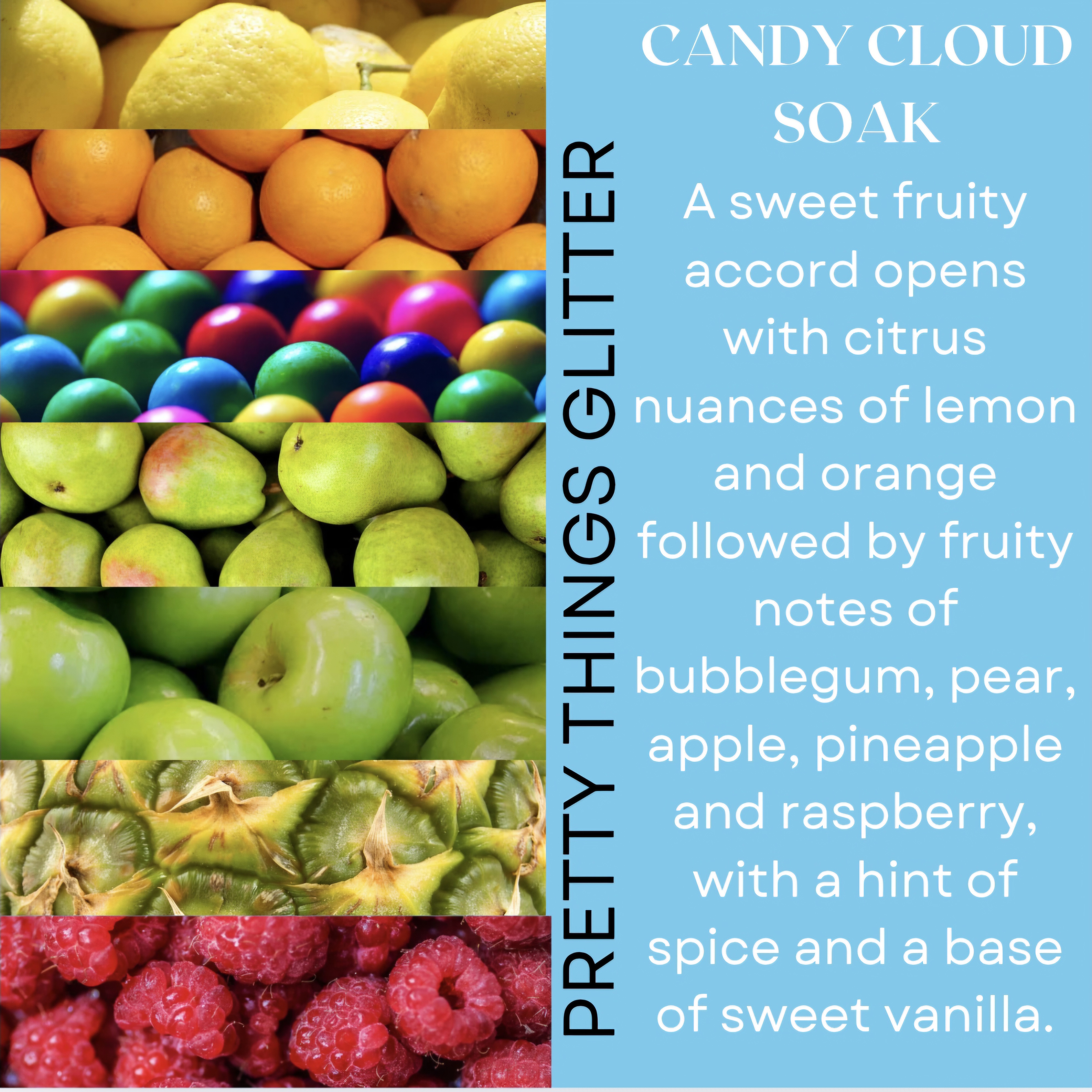 Candy Cloud Soak - A sweet fruity accord opens with citrus nuances of lemon and orange followed by fruity notes of bubblegum, pear, apple, pineapple and raspberry, with a hint of spice and a base of sweet vanilla.