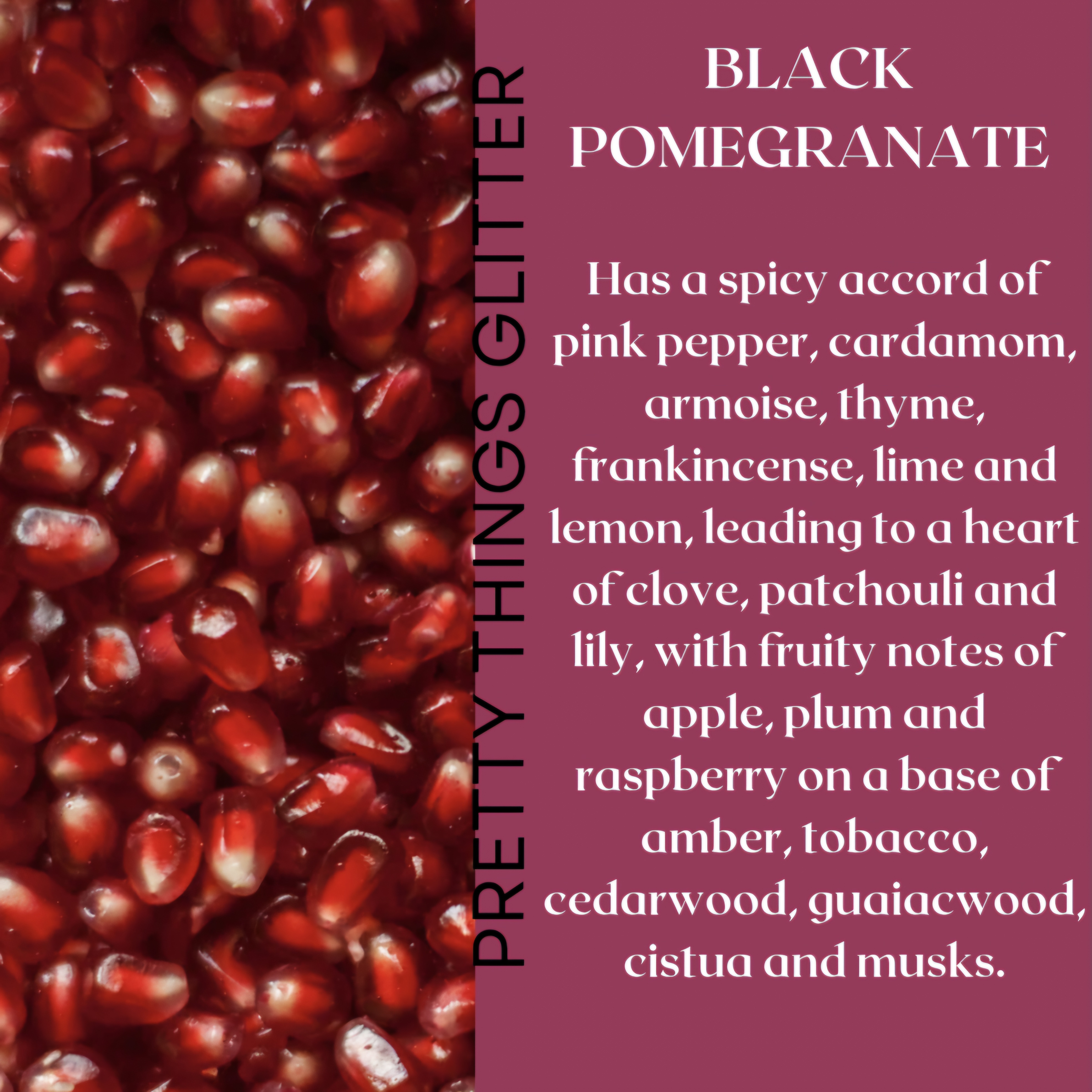 The scent Black Pomegranate has a spicy accord opening with pink pepper, cardamom, armoise, thyme, frankincense, lime and lemon, leading to a heart of clove. patchouli and lily, with fruity notes of apple, plum and raspberry, on a base of amber, tobacco, cedarwood, guaiacwood, cistus and musks.