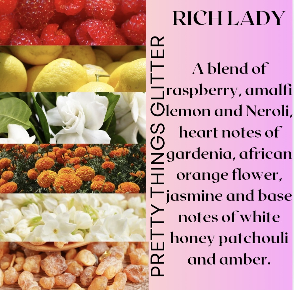 The scent Rich Lady is a blend of raspberry, amalfi lemon and Neroli, heart notes of gardenia, african orange flower, jasmine and base notes of white honey patchouli and amber.