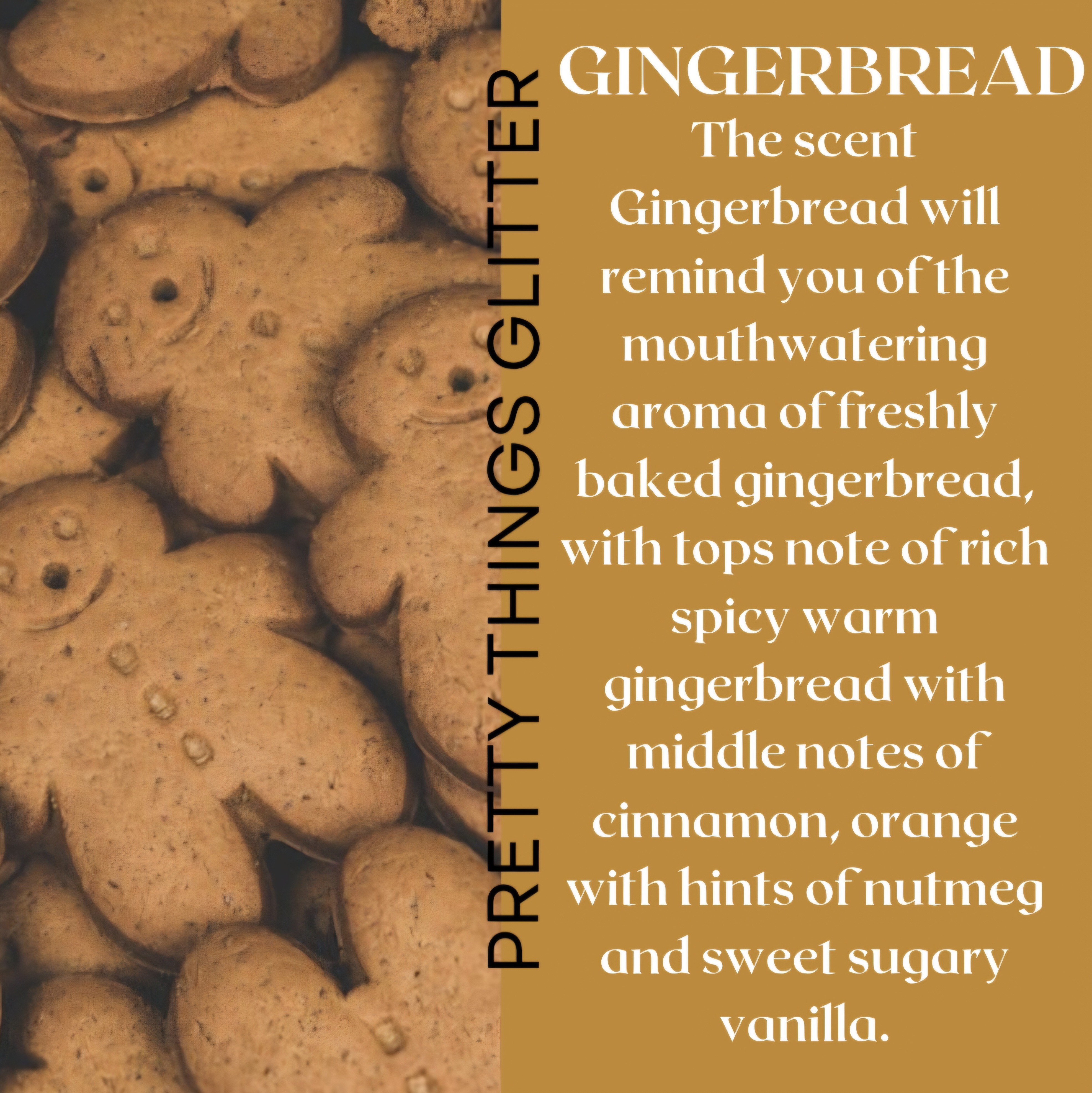 The scent Gingerbread will remind you of the mouthwatering aroma of freshly baked gingerbread, with tops note of rich spicy warm gingerbread with middle notes of cinnamon, orange with hints of nutmeg and sweet sugary vanilla.