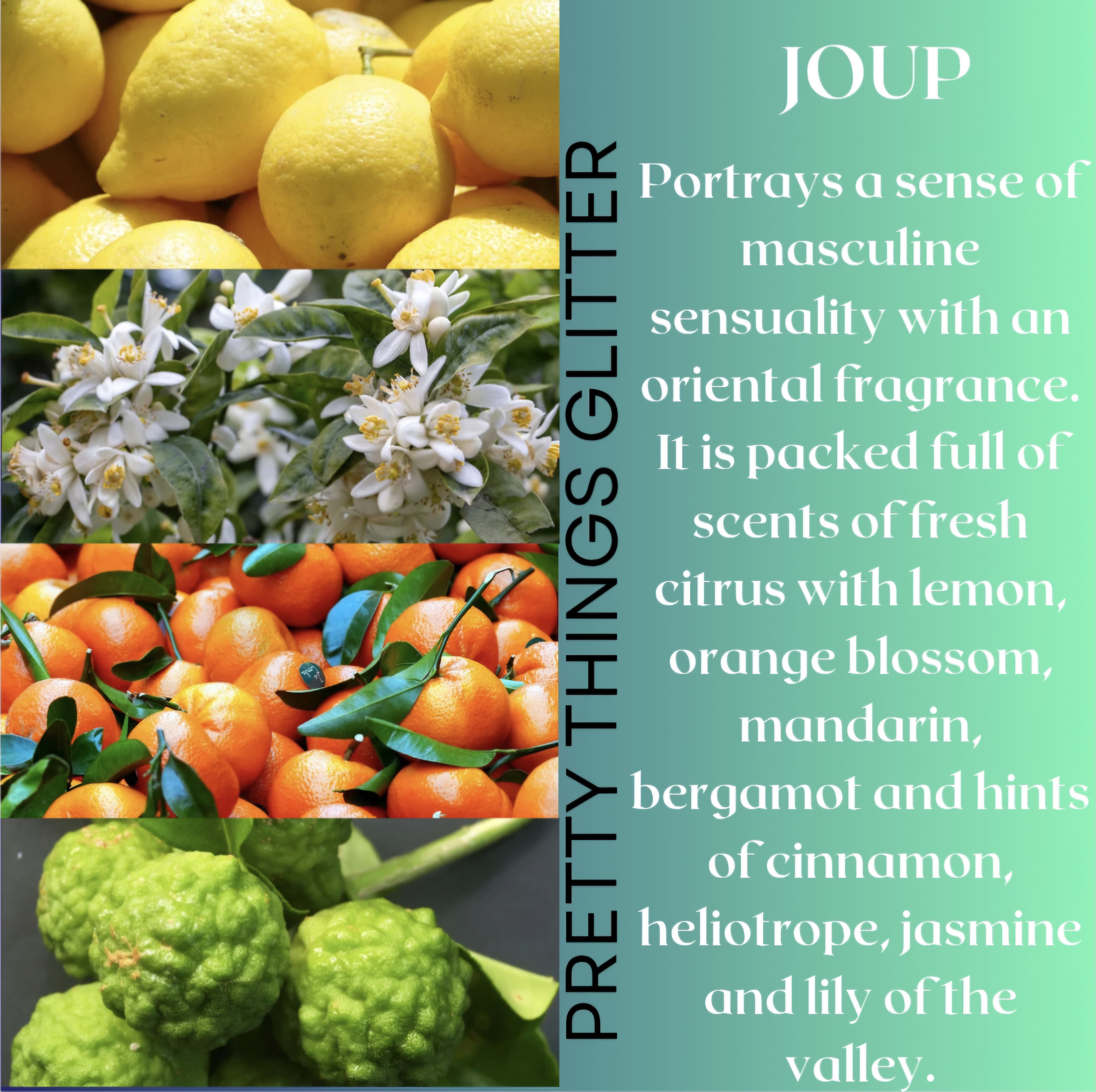 The scent Joup portrays a sense of masculine sensuality with an oriental fragrance. It is packed full of scents of fresh citrus with lemon, orange blossom, mandarin, bergamot and hints of cinnamon, heliotrope, jasmine and lily of the valley.