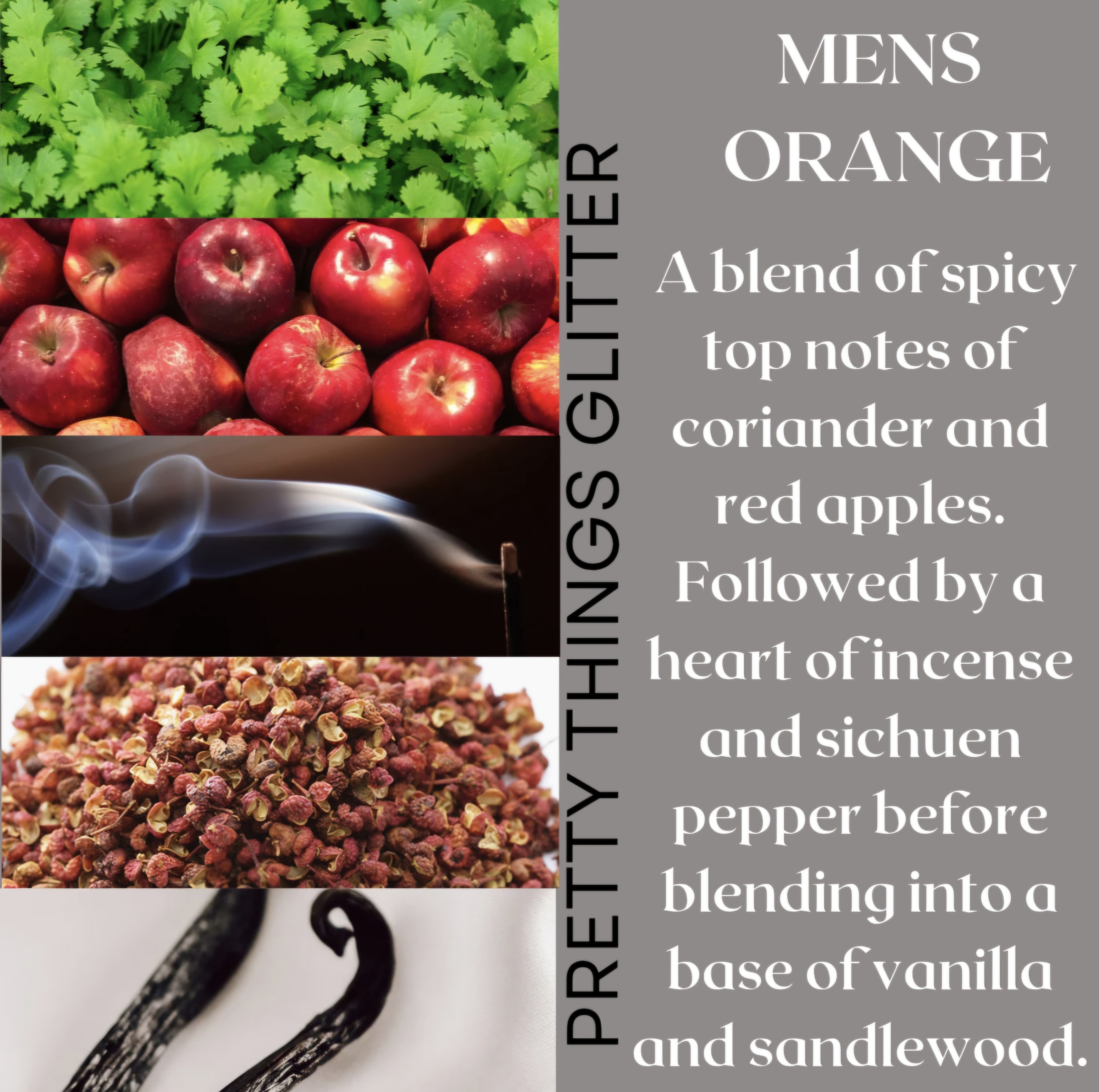The scent Mens Orange has a blend of spicy top notes of coriander and red apples. Followed by a heart of incense and sichuen pepper before blending into a base of vanilla and sandlewood.