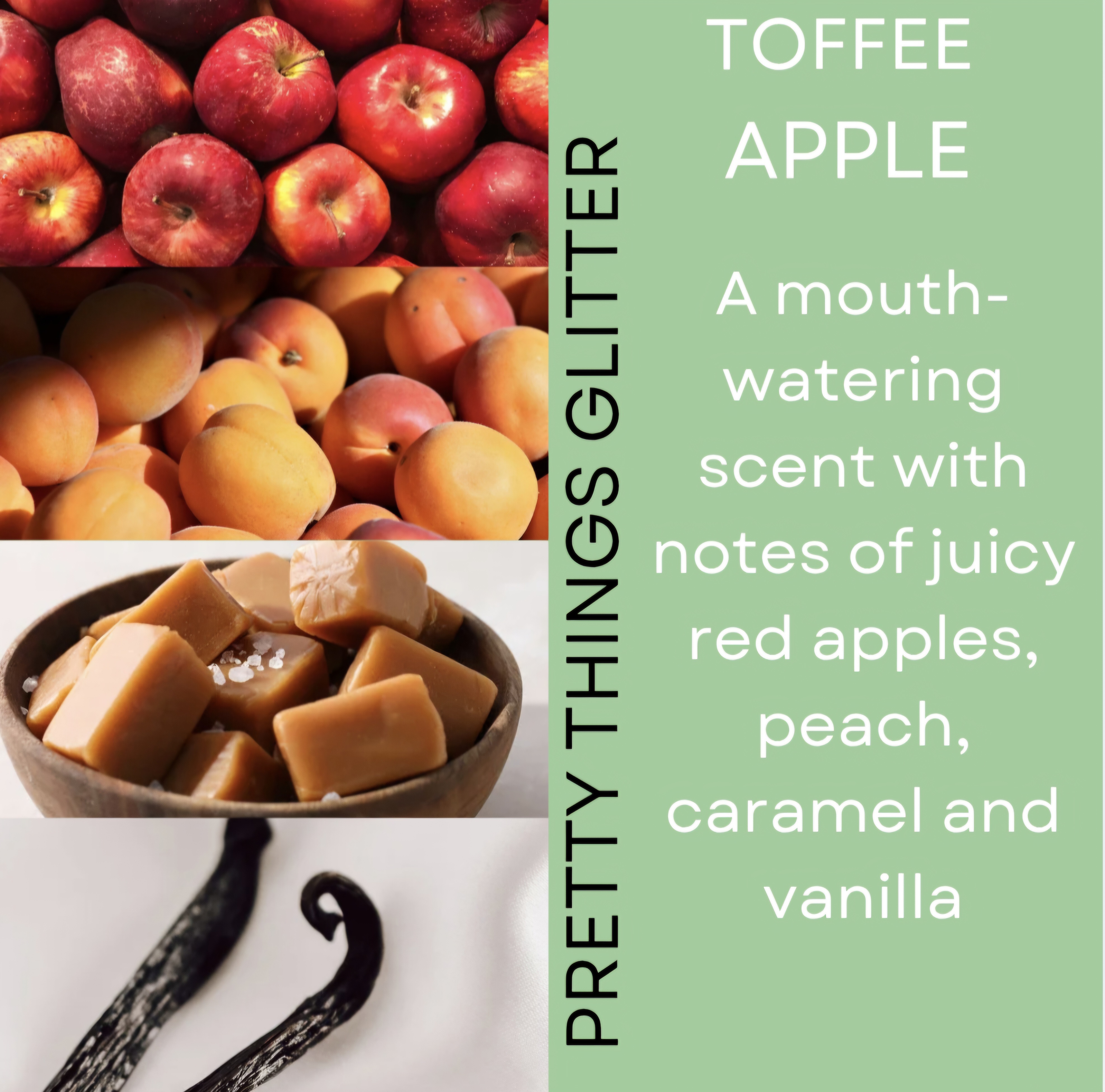 The scent Toffee Apple is a mouthwatering candy apple scent with notes of juicy red apples, peach, caramel and vanilla.