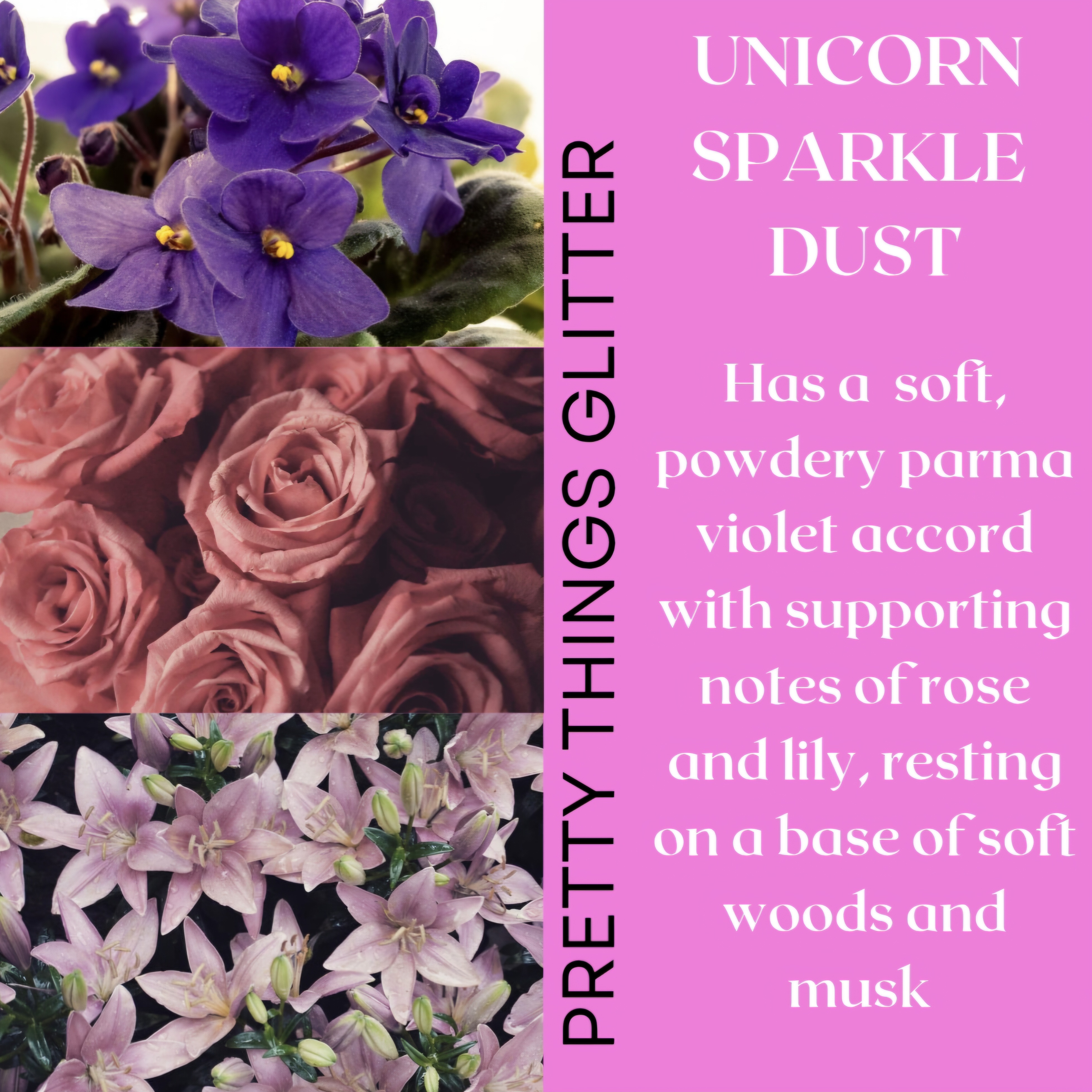 The Unicorn Sparkle Dust scent is a soft, powdery parma violet accord with supporting notes of rose and lily resting on a base of soft woods and musk.