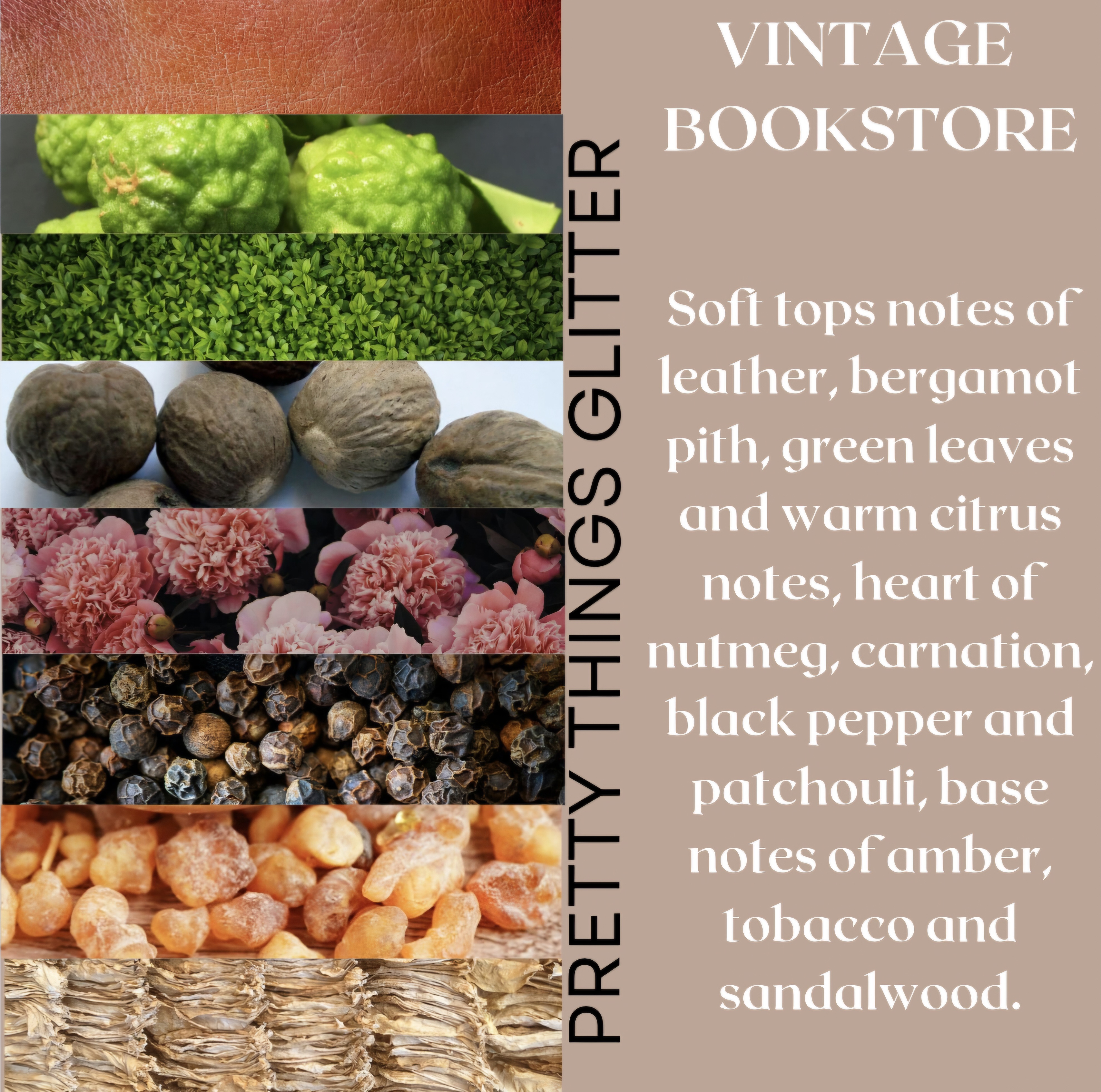 Vintage Bookstore - Soft tops notes of leather, bergamot pith, green leaves and warm citrus notes, heart of nutmeg, carnation, black pepper and patchouli, base notes of amber, tobacco and sandalwood.